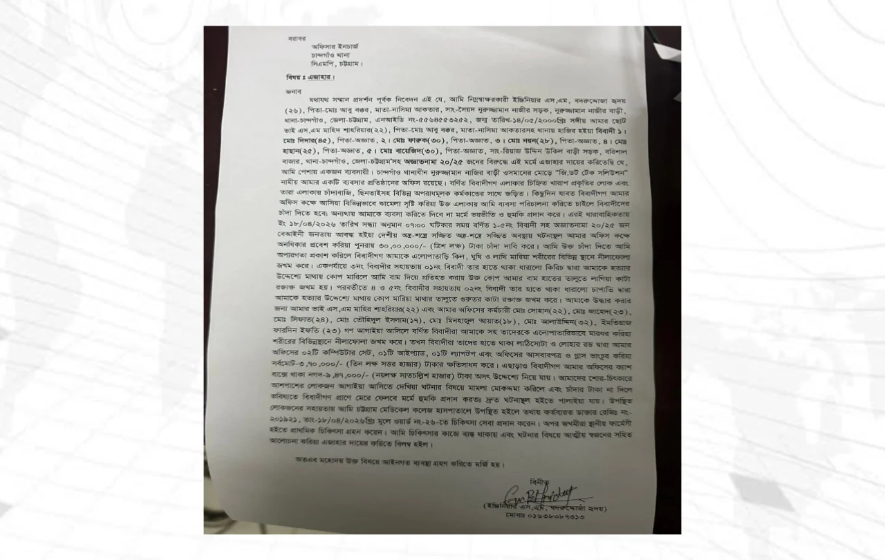 এজাহার সূত্রে জানা গেছে, গত মঙ্গলবার সন্ধ্যা ৭টার দিকে চিহ্নিত ৫ জনসহ ২৫-৩০ জনের একটি সশস্ত্র দল দেশীয় অস্ত্রশস্ত্র নিয়ে হৃদয়ের অফিসে অনধিকার প্রবেশ করে। তারা দীর্ঘদিন ধরে ওই ব্যবসায়ীর কাছে চাঁদা দাবি করে আসছিল। এদিন তারা পুনরায় ৩০ লাখ টাকা চাঁদা দাবি করলে কথা-কাটাকাটি হয়। একপর্যায়ে সন্ত্রাসীরা ধারালো অস্ত্র দিয়ে হৃদয়ের মাথায় ও হাতে এলোপাতাড়ি কোপাতে থাকে। তাকে বাঁচাতে ভাই মাহিন শাহরিয়ার ও অফিসের কর্মচারীরা এগিয়ে এলে তাদেরও বেধড়ক মারধর করা হয়।