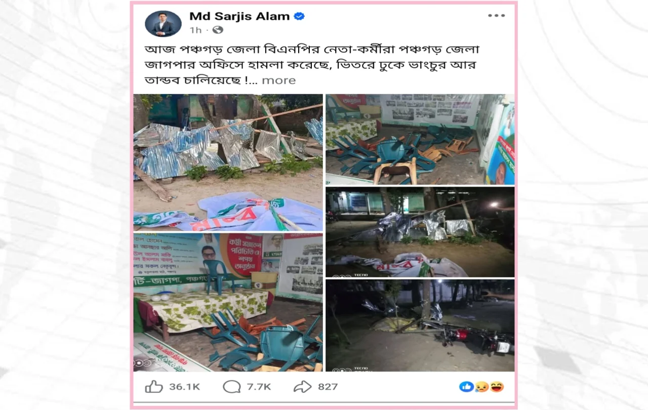 পঞ্চগড়ে জাতীয় গণতান্ত্রিক পার্টির (জাগপা) জেলা কার্যালয়ে ভাঙচুর ও তাণ্ডবের ঘটনায় তীব্র নিন্দা ও ধিক্কার জানিয়েছেন জাতীয় নাগরিক কমিটির উত্তরাঞ্চলীয় মুখ্য সমন্বয়ক সারজিস আলম। শুক্রবার রাতে নিজের ভেরিফাইড ফেসবুক পেজে দেওয়া এক পোস্টে তিনি এই হামলার জন্য জেলা বিএনপির নেতাকর্মীদের দায়ী করেন এবং রাজনৈতিক অসহিষ্ণুতার বিরুদ্ধে কঠোর হুঁশিয়ারি উচ্চারণ করেন।
